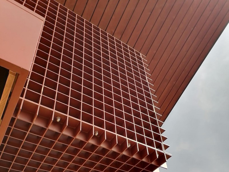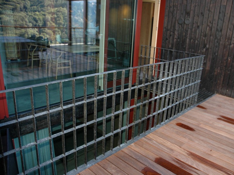 Einfahrtstor und Wandverkleidung samt Postkästen aus selbstgefertigtem Gitterrost aus Stahl, feuerverzinkt und geschwärzt